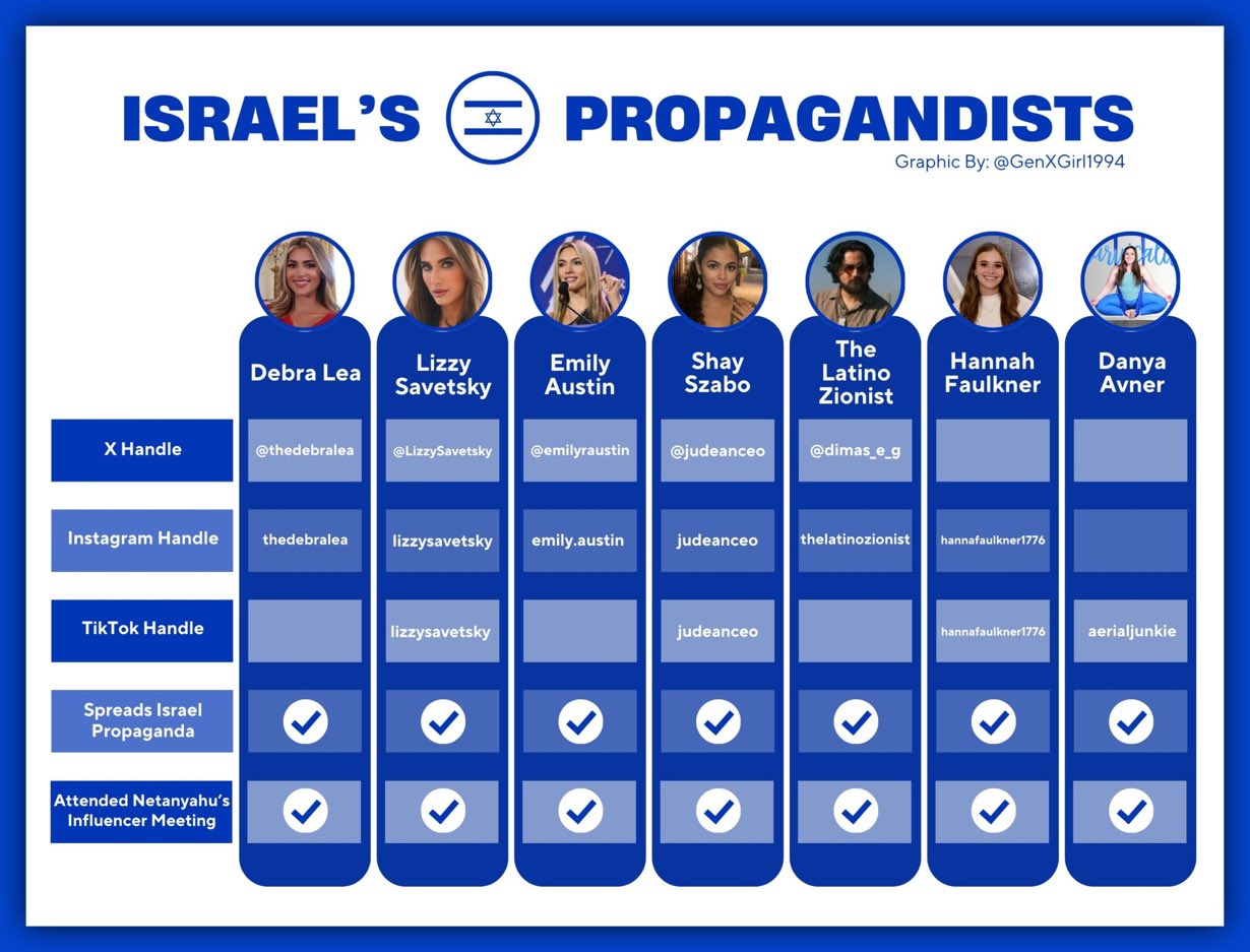 من بين هؤلاء المؤثرين ليزي سافيتسكي، مدونة أزياء وحياة اجتماعية، ومريم عراقي، ممرضة أميركية تنشط على تيك توك حول الحياة الأرثوذكسية اليهودية، وزاك فوكس، صانع محتوى فيديو معروف بتأييده المطلق لإسرائيل.