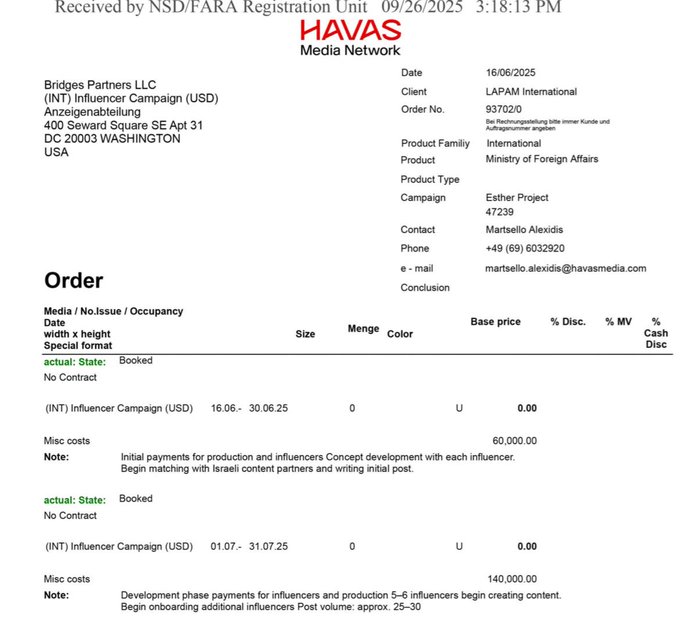 وأظهرت أن شركة "بريدج بارتنرز" Bridge Partners، المتعاقدة مع وزارة الخارجية الإسرائيلية، أرسلت سلسلة فواتير عن تكاليف حملة "المؤثرين" الموالين لإسرائيل، إلى مجموعة الإعلام الدولية "هافاس ميديا جروب" في ألمانيا، التي تعمل لصالح إسرائيل.