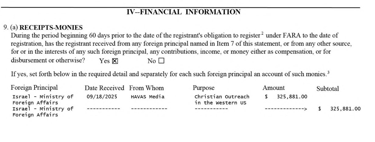 وخلال شهرين فقط قبضت هذه الشركة 325 ألف دولار من إسرائيل لتسويق سرديتها وتبرير الإبادة بين المسيحيين في الغرب الأميركي.