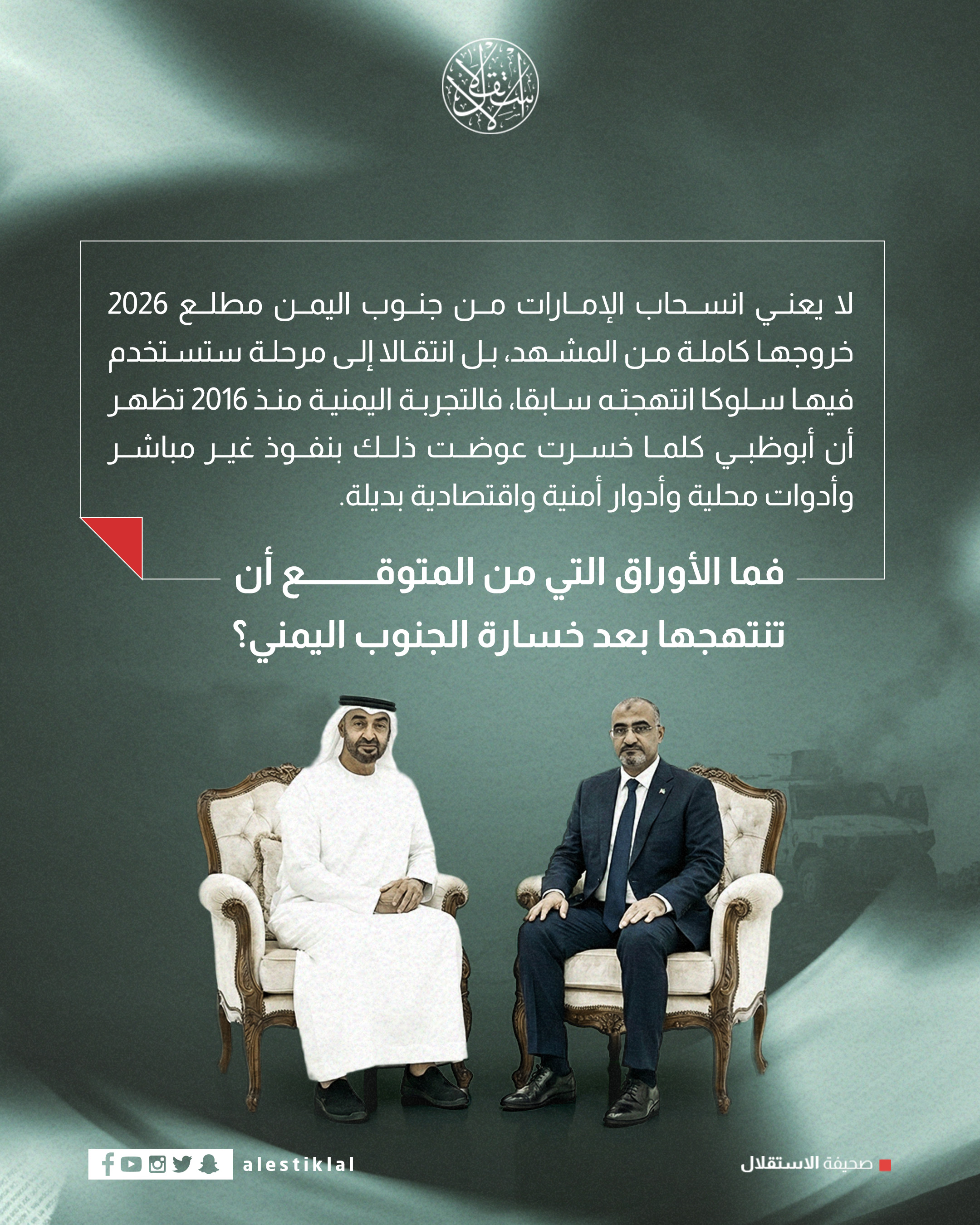 بعد خروجها من جنوب اليمن.. 4 مسارات قد تنتهجها الإمارات (إنفوجراف)إنفوجرافأيضــــــــــــاخلاف الحلفاء في اليمن.. أين تقف واشنطن وتل أبيب من الصدام السعودي–الإماراتي؟انقسام يلوح بالأفق.. ما مصير "المجلس الانتقالي" بعد مؤتمر الرياض المرتقب؟محام وناشط مقدسي: عسكرة القدس تنسف حلم دولة فلسطين (إنفوجراف)من دون رصاصة واحدة.. كيف يستفيد الحوثي من صراعات خصومه في حضرموت؟عقب خروجها من اليمن وهروب الزبيدي.. كيف تخطط الإمارات لتفجير المشهد الجنوبي؟تواطؤ صامت.. كيف وصلت الأسلحة الأوروبية إلى مليشيا الدعم السريع؟منذ يومينإنفوجرافبعد خروجها من جنوب اليمن.. 4 مسارات قد تنتهجها الإمارات (إنفوجراف)مسار زمني.. ماذا يحدث في إيران؟ (إنفوجراف)فنزويلا.. بلد غني وشعب فقير (إنفوجراف)محام وناشط مقدسي: عسكرة القدس تنسف حلم دولة فلسطين (إنفوجراف)الخليجمن جذب الاستثمارات إلى "استقطاب الكفاءات".. قرار سعودي يشعل السباق مع مصرخلاف الحلفاء في اليمن.. أين تقف واشنطن وتل أبيب من الصدام السعودي–الإماراتي؟تواطؤ صامت.. كيف وصلت الأسلحة الأوروبية إلى مليشيا الدعم السريع؟من دون رصاصة واحدة.. كيف يستفيد الحوثي من صراعات خصومه في حضرموت؟اليمنبعد خروجها من جنوب اليمن.. 4 مسارات قد تنتهجها الإمارات (إنفوجراف)عقب خروجها من اليمن وهروب الزبيدي.. كيف تخطط الإمارات لتفجير المشهد الجنوبي؟خلاف الحلفاء في اليمن.. أين تقف واشنطن وتل أبيب من الصدام السعودي–الإماراتي؟أسلحة في مقرات الإغاثة بحضرموت.. كيف استُخدم الهلال الأحمر الإماراتي كواجهة عسكرية؟